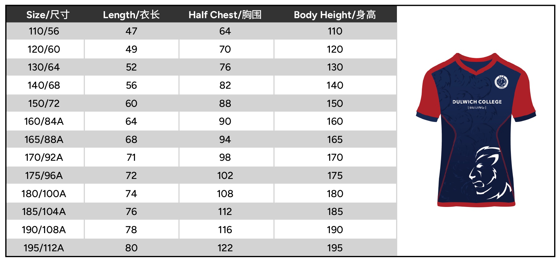 Size 110 or 120 or 130 or 140 or 150 or 160 or 165 or 170 or 175 or 180 or 185 or 190 or 195