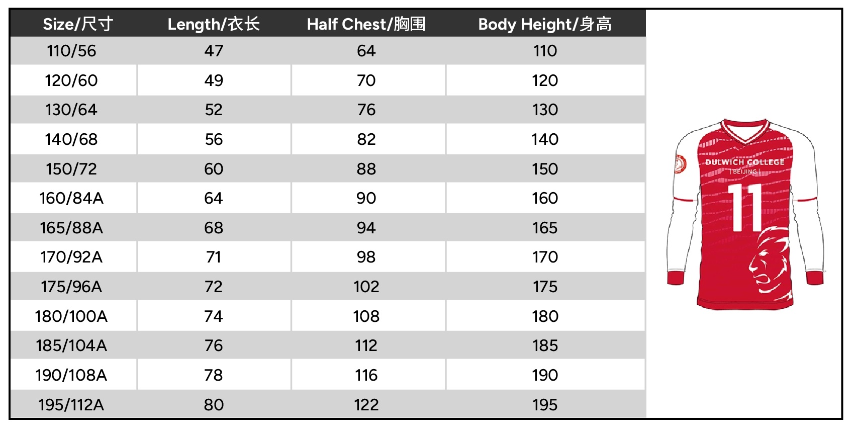 Size 110 or 120 or 130 or 140 or 150 or 160 or 165 or 170 or 175 or 180 or 185 or 190 or 195