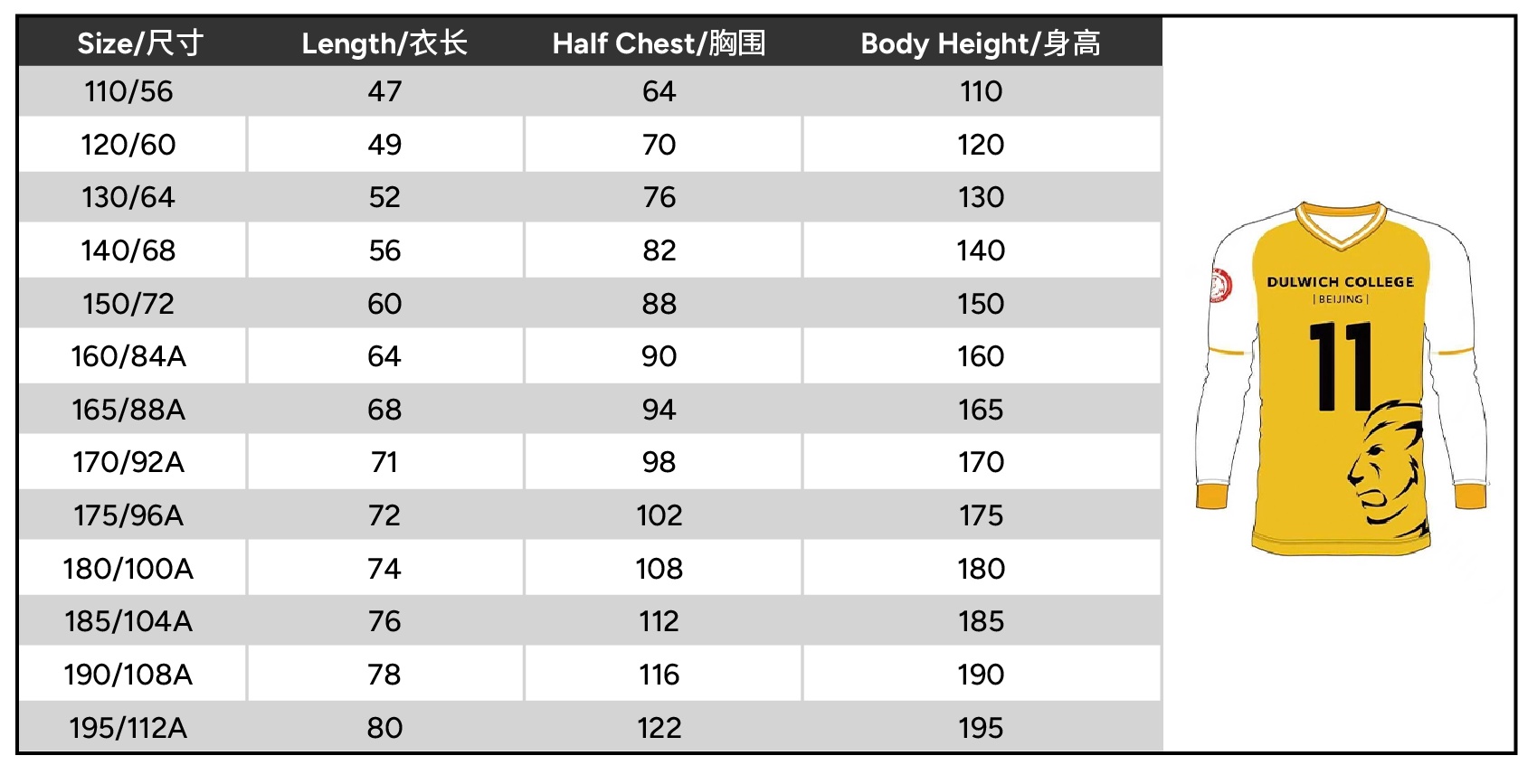 Size 110 or 120 or 130 or 140 or 150 or 160 or 165 or 170 or 175 or 180 or 185 or 190 or 195