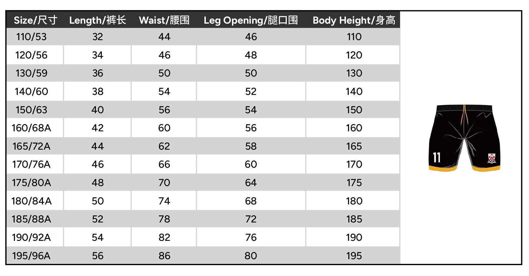 | Size | 110 or 120 or 130 or 140 or 150 or 160 or 165 or 170 or 175 or 180 or 185 or 190 or 195 |