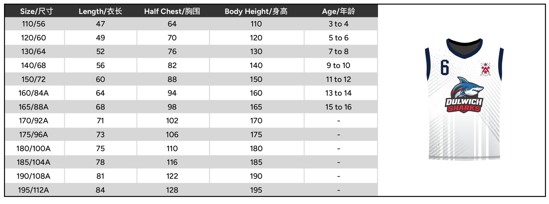 Size 110 or 120 or 130 or 140 or 150 or 160 or 165 or 170 or 175 or 180 or 185 or 190 or 195